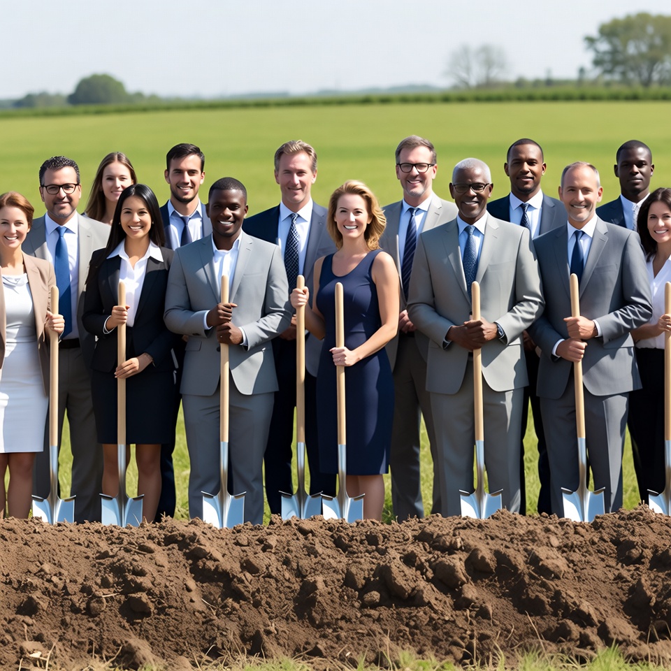 A large diverse group of men and women in business suits stands together in a green field, each holding a shovel. They pose in front of a freshly dug pile of dirt, suggesting a groundbreaking ceremony. The team includes White, Black, Asian, and Latino professionals smiling confidently.