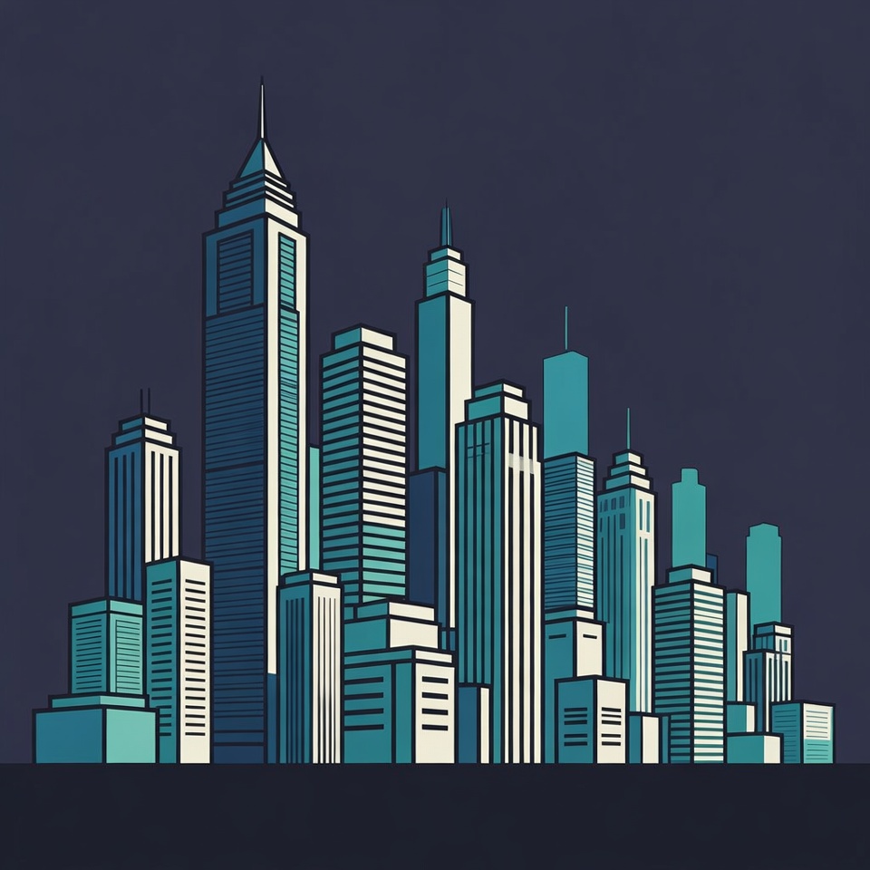 A minimalist flat illustration of a modern city skyline features tall skyscrapers in shades of teal and white. The buildings vary in height with pointed spires and rectangular shapes against a dark navy background. The design uses clean lines and isolated elements for a striking urban silhouette.
