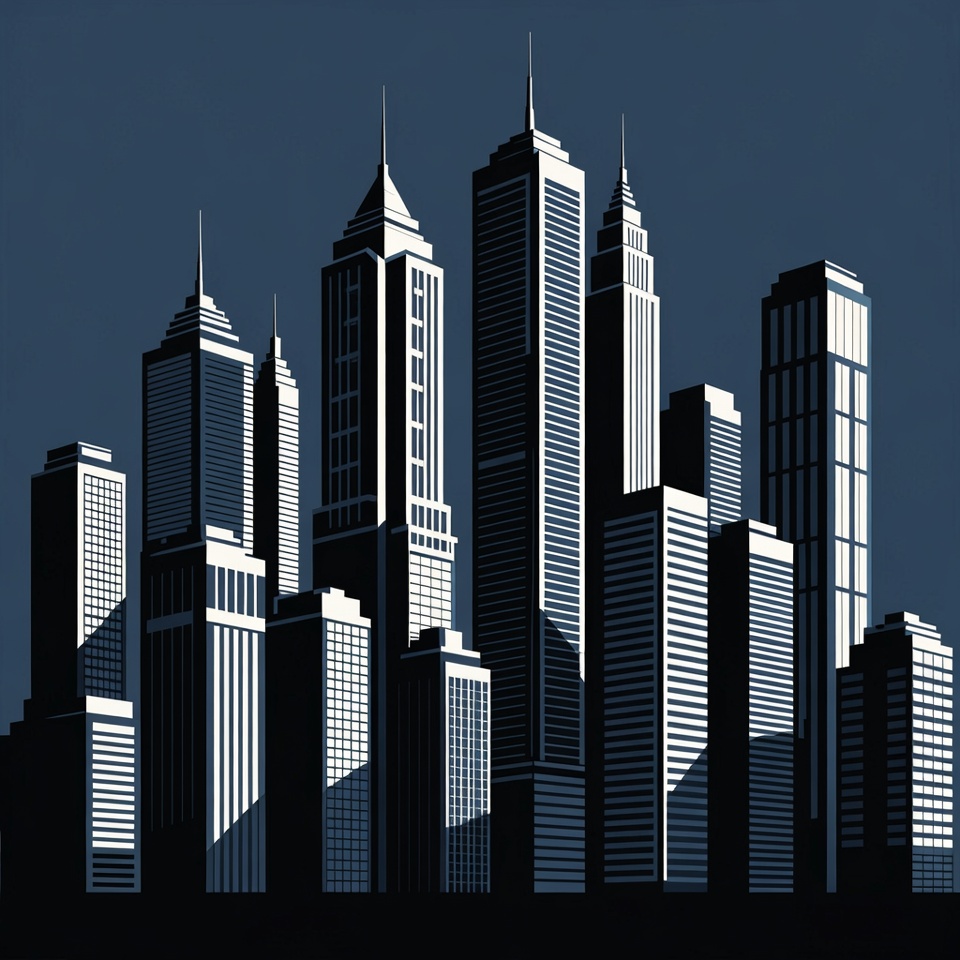 A minimalist illustration of a city skyline features tall skyscrapers in sharp black silhouettes against a deep navy blue background. The buildings vary in height with pointed spires and rectangular forms. The design uses high contrast white outlines on dark shading for a modern vector art style.