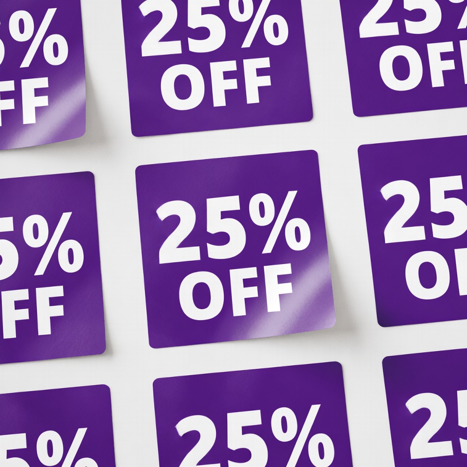 Multiple purple square stickers with bold white '25% OFF' text are arranged in a grid on a white background. The stickers have a glossy, slightly curled appearance to mimic real labels. They are uniformly designed for promotional use.