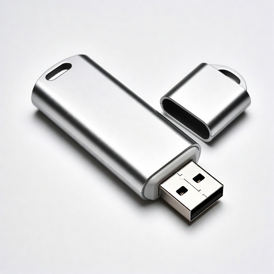 USB flash, USB stick, cap removed, data storage, flash drive, keychain loop, memory stick, metallic, portable, silver, silver USB, storage device, technology, white background, USB drive
