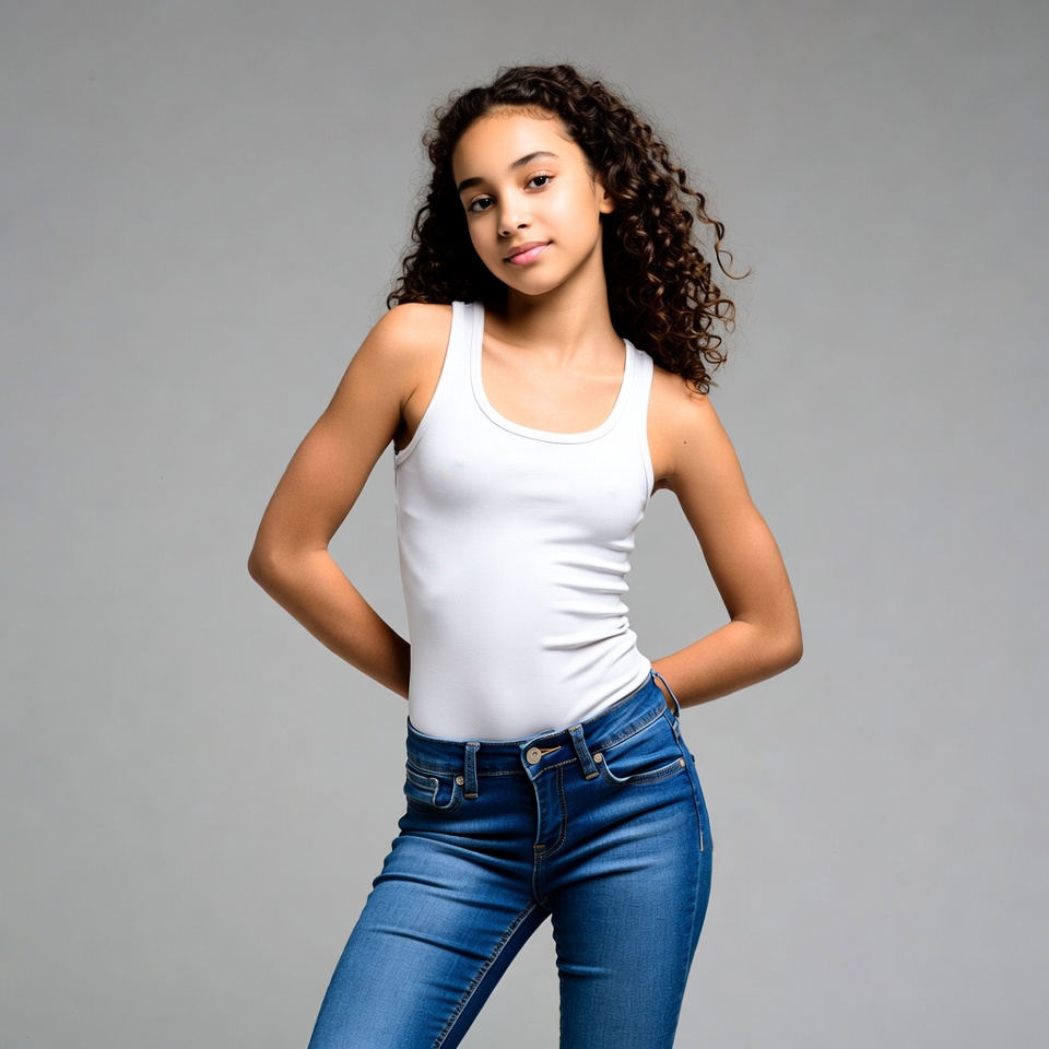 A young mixed-race girl with curly hair stands in a slight pose against a gray background. She wears a white tank top and blue skinny jeans, with hands on her hips. Her expression is confident and she looks directly at the camera.