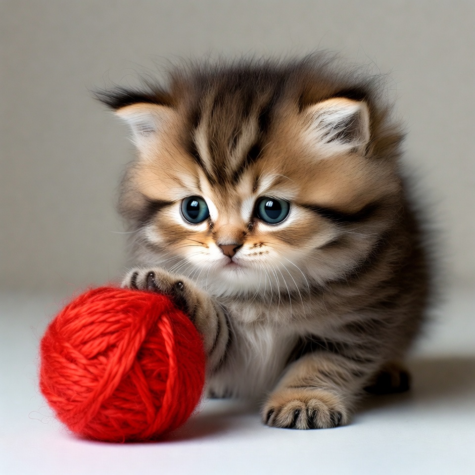 A fluffy British Shorthair kitten with tabby markings and striking blue eyes plays with a red yarn ball. The kitten gently paws at the ball on a plain white background. Its fur is soft and striped in brown and gold tones.