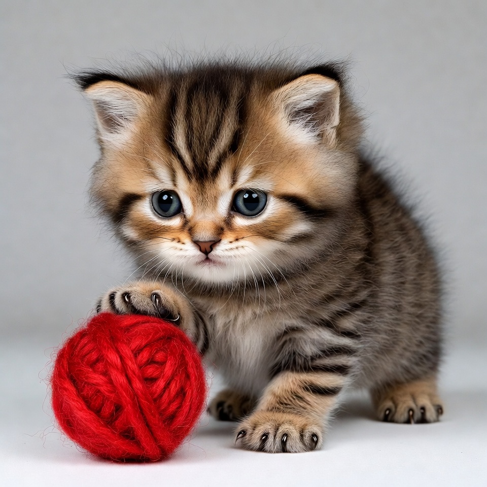 A cute tabby kitten with brown and black stripes plays with a red yarn ball on a white background. The kitten has big blue eyes and paws at the fuzzy ball. Its fluffy fur and playful pose are captured in close-up.