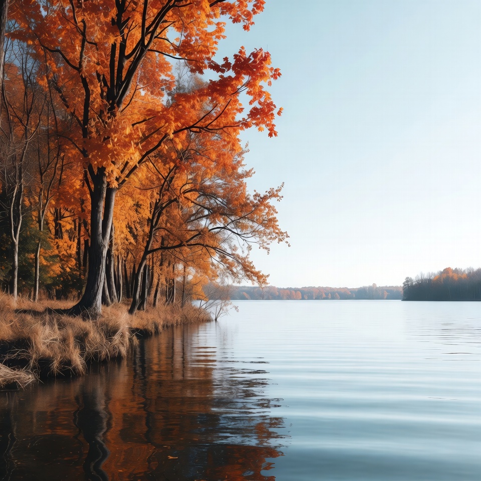 autumn scenery, blue sky, calm water, fall foliage, fall landscape, foliage, forest edge, golden hour, lake, maple trees, nature, orange leaves, outdoors, peaceful lake, red leaves, reeds, seasonal, shore, tree line, trees by lake, vibrant colors, water reflection, woods, autumn trees