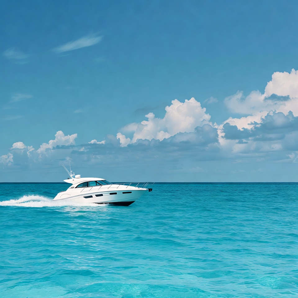 blue sky, boat wake, boating, cabin cruiser, clear water, clouds, cruising boat, cumulus clouds, luxury yacht, marine, motor yacht, nautical, ocean, ocean waves, powerboat, sea, sky, speed boat, speedboat, tropical sea, turquoise water, vessel, watercraft, white boat, white yacht, yacht