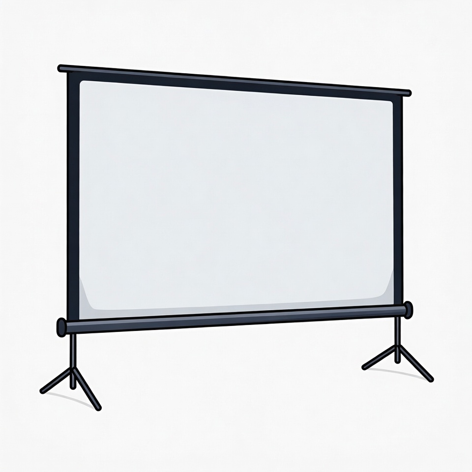 A simple illustration of a white blank projection screen on a black tripod frame. The screen is rectangular and mounted on a horizontal roller bar. It stands on a transparent isolated background.