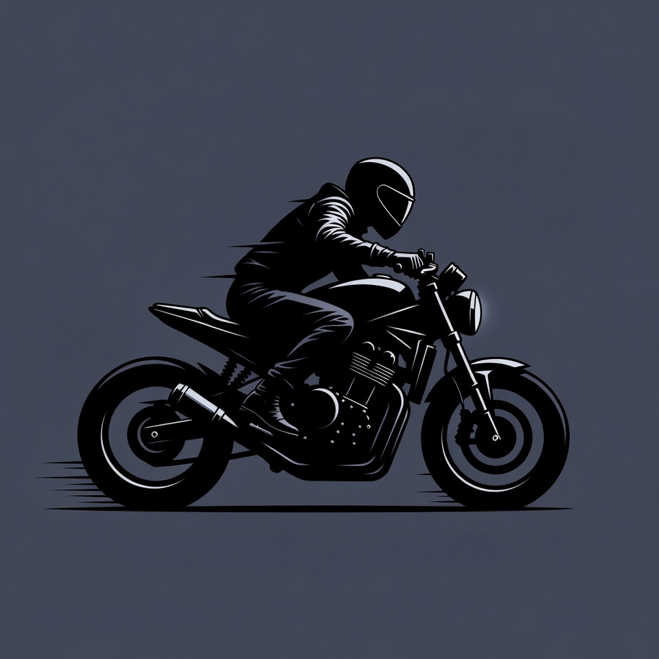 A black silhouette illustration depicts a man in a helmet and jacket riding a sleek cafe racer motorcycle at high speed. The rider leans forward dynamically with motion blur on the wheels and exhaust. The image features a dark navy background with white outlines.