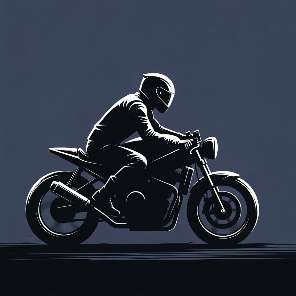 A black silhouette illustration depicts a man riding a classic motorcycle from a side view. He wears a full-face helmet, leather jacket, pants, and boots while gripping the handlebars. The image features a dark navy background with subtle highlights on the bike's headlight, exhaust, and wheels.