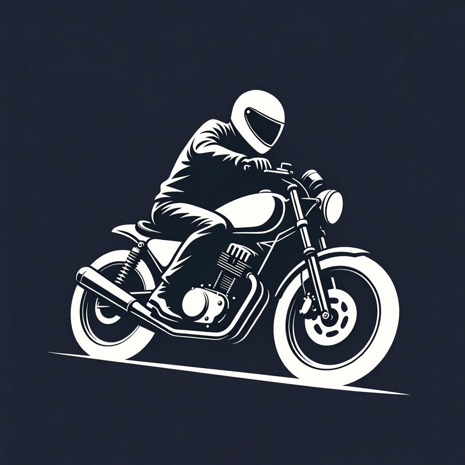 A white line art illustration on a dark blue background depicts a man riding a classic motorcycle. He wears a full-face helmet, leather jacket, pants, and boots while leaning forward on the bike. The motorcycle features a round headlight, exposed engine, and thick tires, shown in dynamic motion.