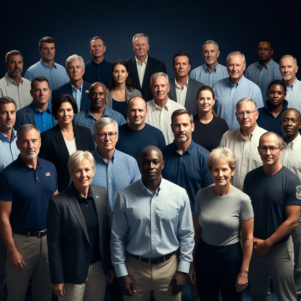 A large group of diverse professionals stands together in a formal team portrait against a dark background. The group includes men and women of various ages, ethnicities including White, African-American, and others, dressed in business attire such as suits, shirts, and blouses. They pose confidently in multiple rows for a corporate headshot.