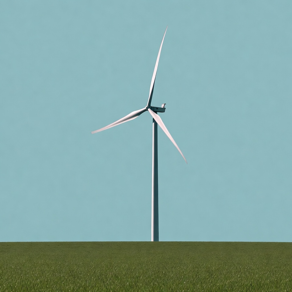 3D render, blue sky, clean energy, environment, grass, green field, isolated background, power generation, renewable energy, tall tower, three blades, turbine, white blades, windmill, wind turbine