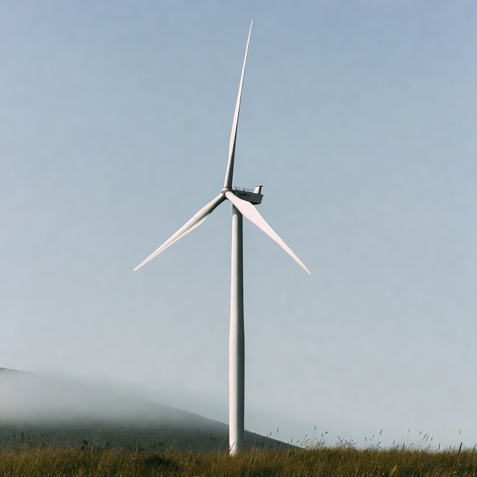 blue sky, clean energy, energy, fog, grass, grassy field, green grass, isolated background, misty mountains, nature, outdoors, renewable energy, rural landscape, sustainable, three blades, turbine, white turbine, wind power, windmill, wind turbine
