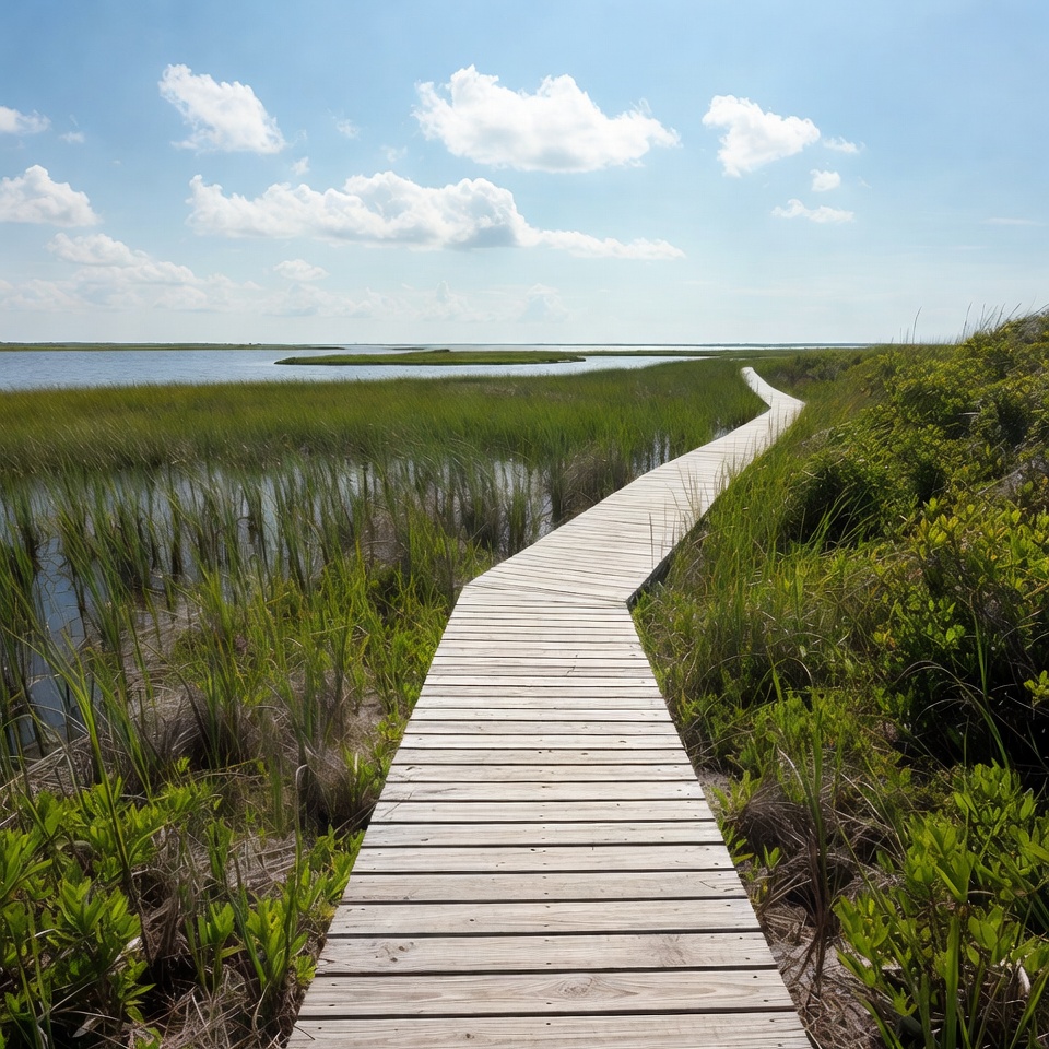A long wooden boardwalk winds through lush green marsh grasses toward a calm body of water under a bright blue sky with scattered white clouds. The path is flanked by dense vegetation and shallow wetlands on both sides. The scene features a serene coastal landscape with clear horizons.