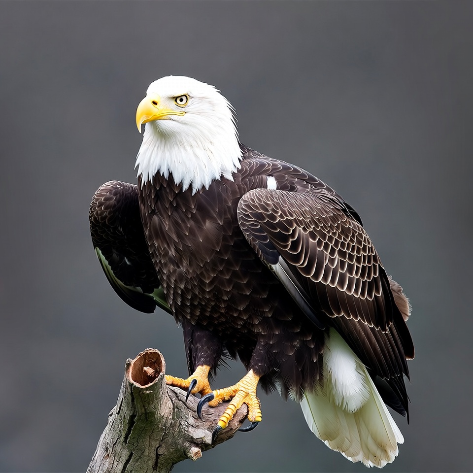 A majestic bald eagle with white head, yellow beak, and dark brown body stands perched on a wooden branch. Its wings are slightly spread, showcasing detailed feathers. The background is a solid dark gray.