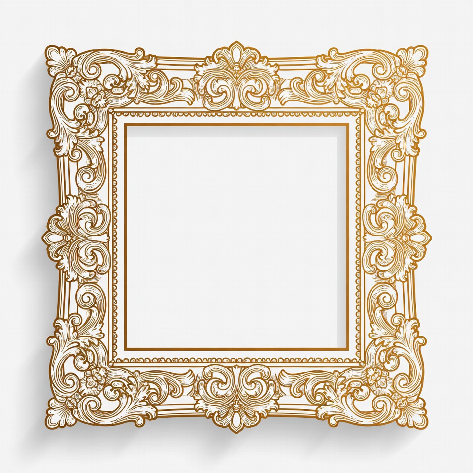 baroque frame, blank frame, clipart, decorative frame, empty frame, filigree, floral motifs, golden border, illustration, isolated, luxury frame, ornate frame, photo frame, picture frame, rococo design, scrollwork, vector art, vintage frame, white background, gold frame