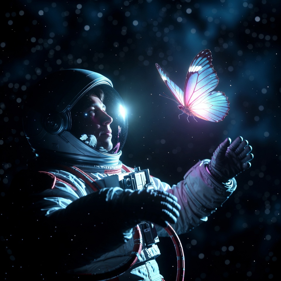 Astronaut reaching for glowing butterfly