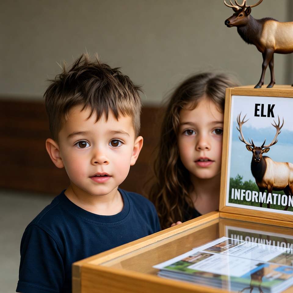 A young boy with spiky brown hair and a girl with long wavy hair stand in front of a wooden elk information display. A large toy elk figure stands atop the sign labeled 'ELK' with scenic images below. Brochures are visible inside the glass-fronted case.