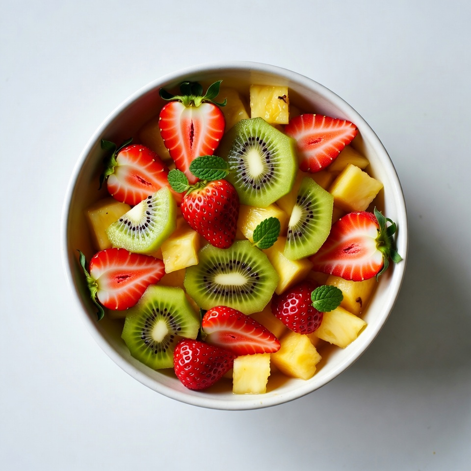 A white bowl filled with a colorful fruit salad sits on a plain white background. It contains sliced strawberries, kiwis, pineapple chunks, and fresh mint leaves. The fruits are arranged vibrantly with green kiwi slices, red strawberries, and yellow pineapple.