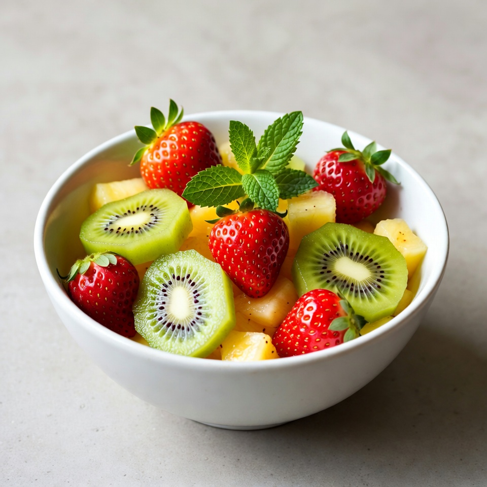 A white bowl filled with sliced strawberries, kiwis, and pineapple chunks sits on a gray surface. Fresh mint leaves garnish the vibrant fruit salad. The fruits are arranged neatly with green kiwi slices, red strawberries, and yellow pineapple.