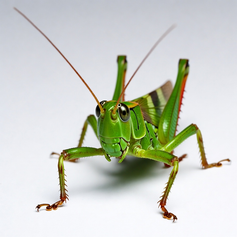 A vibrant green grasshopper with large black eyes and long antennae stands on a plain white background. Its body features yellow and black stripes on the wings and red-tipped legs. The insect is captured in a close-up view, showcasing its detailed exoskeleton and poised stance.