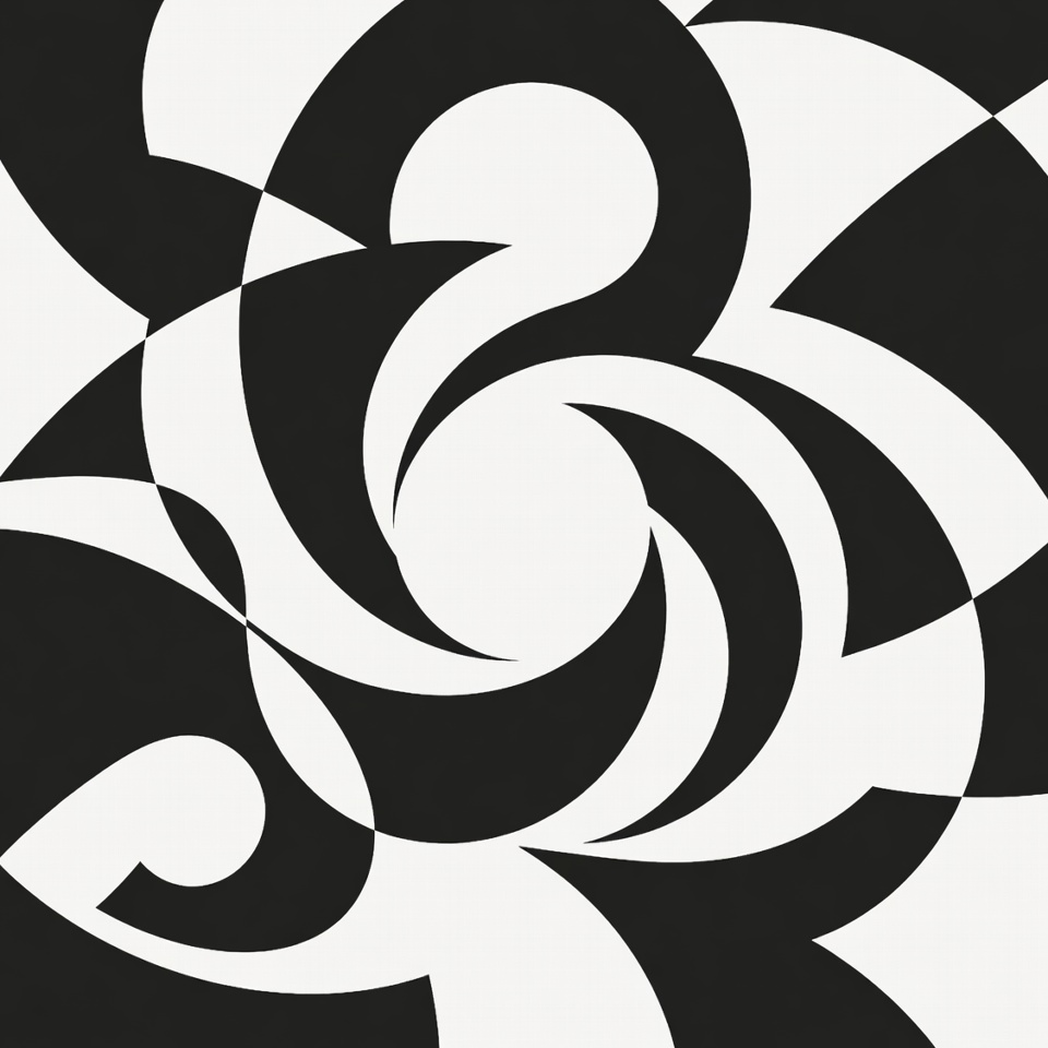 abstract pattern, angular forms, black white, clipart, curved lines, dynamic design, geometric design, high contrast, illustration, isolated background, modern art, monochrome, op art, optical illusion, spiral shapes, swirl pattern, symmetric pattern, vector art, abstract art