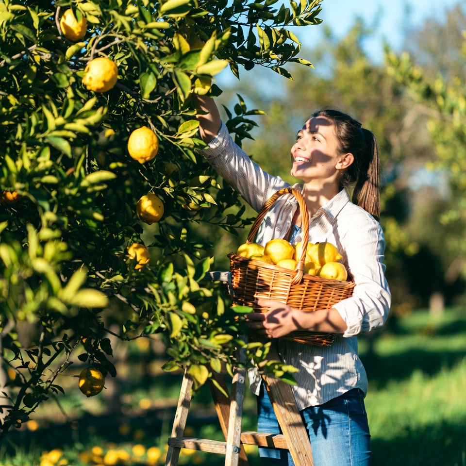 A smiling woman with ponytail reaches up to pick ripe yellow lemons from a tree branch. She holds a wicker basket filled with lemons in her other hand and stands on a ladder in a sunny orchard. She wears a white blouse and jeans amid green foliage and grass.