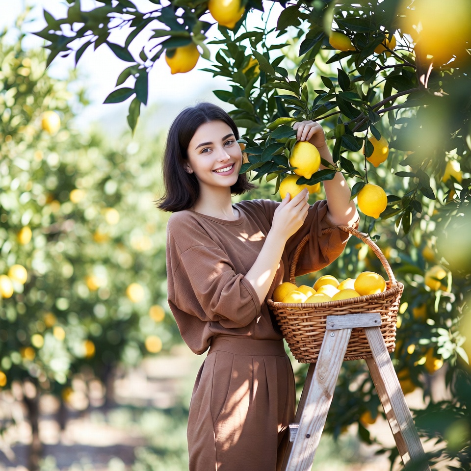 A young woman with dark shoulder-length hair stands on a ladder in a lemon orchard, picking ripe yellow lemons from the tree branches. She wears a loose-fitting brown outfit and holds a woven basket filled with lemons in one hand while reaching for more with the other. The background features lush green lemon trees heavy with fruit under a sunny sky.