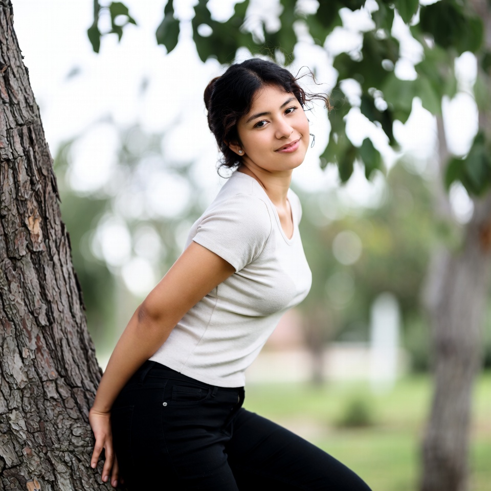 A young Asian woman with dark wavy hair in a bun smiles while leaning against a large tree trunk outdoors. She wears a light beige short-sleeve top and black pants, standing on green grass with trees and foliage in the background. Her pose is relaxed with one hand on the tree bark.
