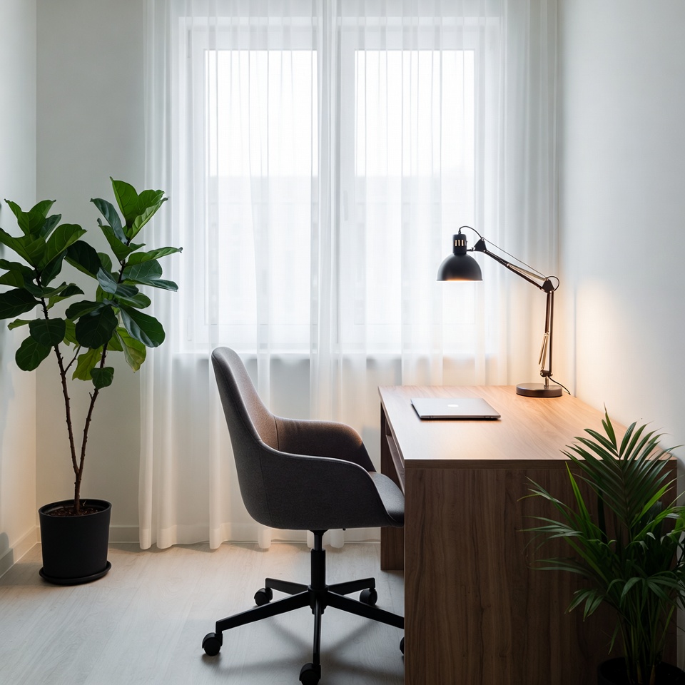 bright room, clean desk, contemporary decor, desk accessories, desk lamp, empty office, ferns, fiddle leaf fig, gray chair, home office, interior design, laptop, large windows, light floor, minimal office, modern office, natural light, office interior, plant decor, potted plants, sheer curtains, swivel chair, white walls, wooden desk, workspace, office desk