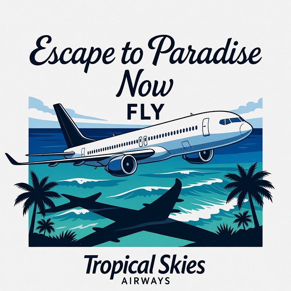 A white airplane flies low over turquoise ocean waves with palm trees on a beach. Bold text reads 'Escape to Paradise Now' above and 'Tropical Skies Airways' below. The illustration features a clean, graphic style on an isolated white background.