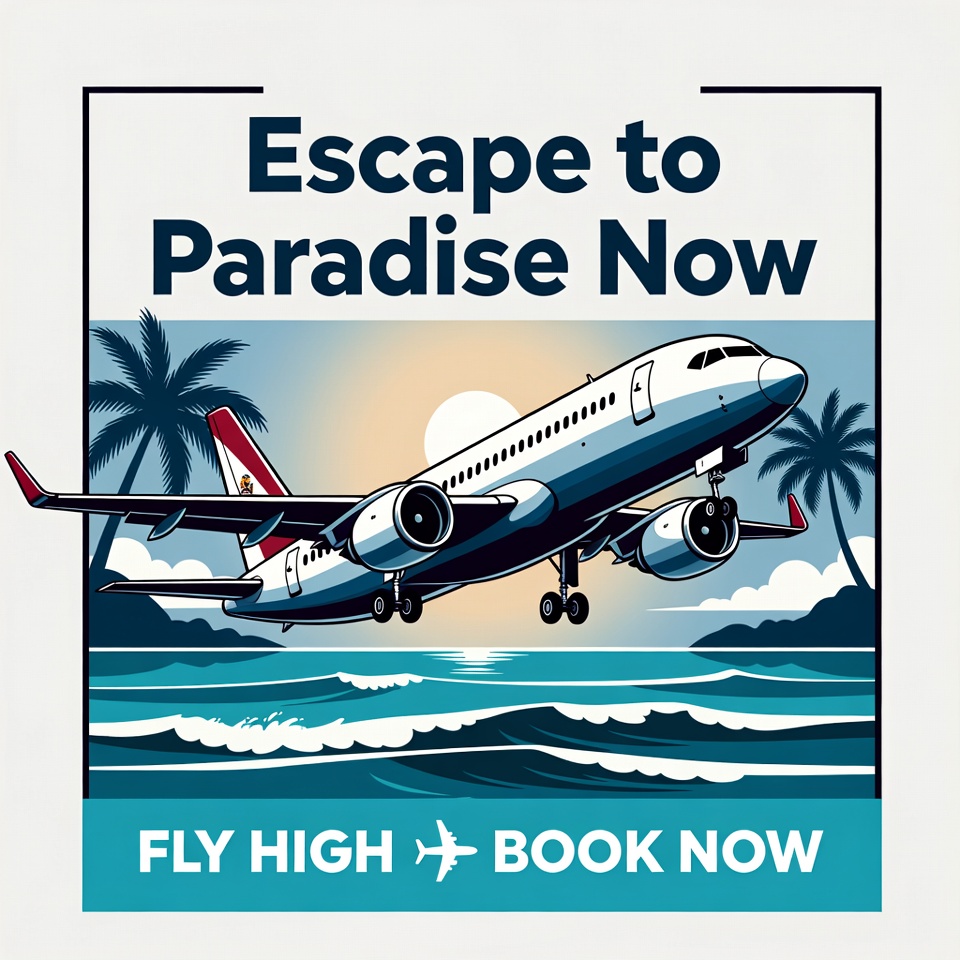 A stylized illustration shows a white airplane with red tail flying over blue ocean waves toward a tropical beach at sunset. Palm trees frame the scene on both sides, with a large sun low on the horizon and clouds in the sky. Bold text reads 'Escape to Paradise Now' and 'FLY HIGH BOOK NOW' at the top and bottom.