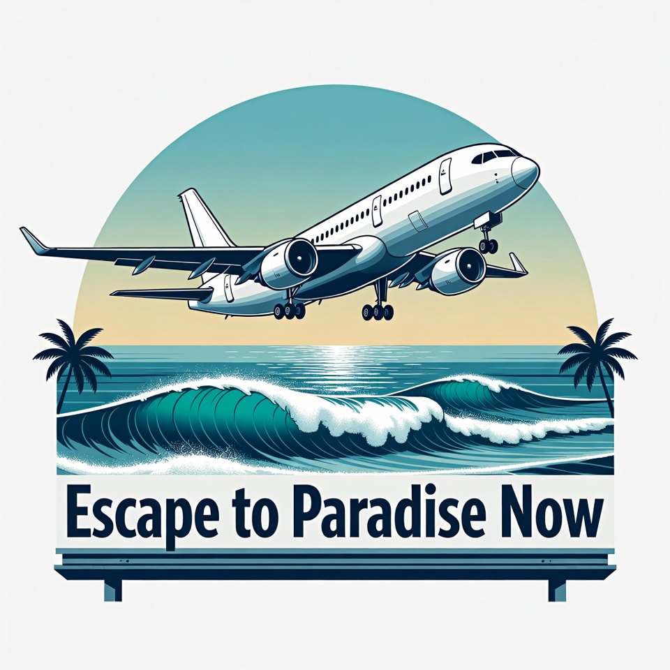 A white passenger airplane flies above crashing turquoise ocean waves with palm trees on a sunset sky background. The scene features a circular emblem design with the text 'Escape to Paradise Now' on a sign below. It is a vibrant vector illustration with isolated elements.