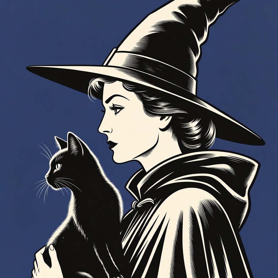 Halloween, White, black cat, blue background, fantasy, female, gothic, holding cat, hooded cape, illustration, isolated background, line art, magic, pet cat, pointed hat, profile view, serious expression, updo hair, vintage style, witch hat, woman, witch