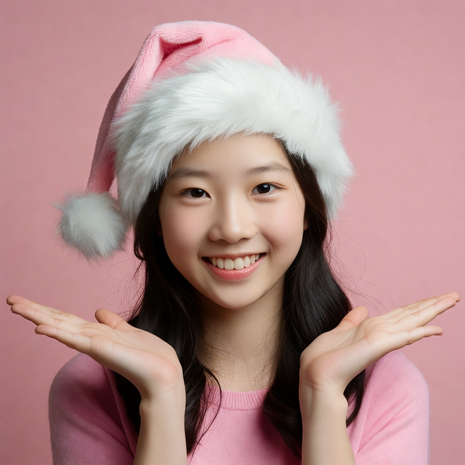 A young Asian girl with long black hair smiles happily while wearing a pink Santa hat with white fur trim and pom-pom. She has her hands raised with palms open, dressed in a pink sweater against a solid pink background. Her expression is cheerful and engaging.