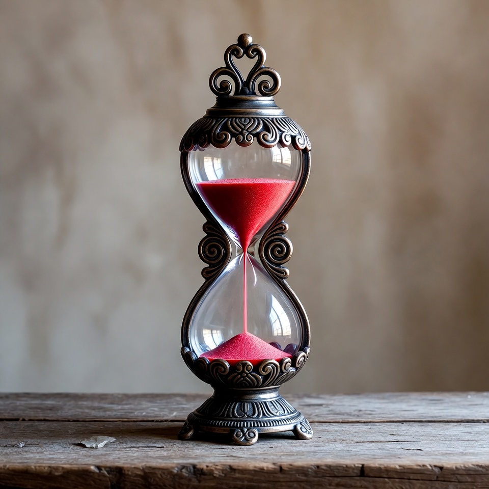 An ornate bronze hourglass with red sand flows from the upper bulb to the lower one. It features intricate filigree designs and stands on a rustic wooden table. The background is a soft beige wall.
