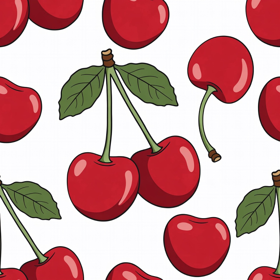 cartoon cherries, cherry design, cherry illustration, cherry pattern, clipart, fruit, fruit pattern, green leaves, isolated background, red cherries, red fruit, seamless pattern, stems, vector cherries, white background, cherries