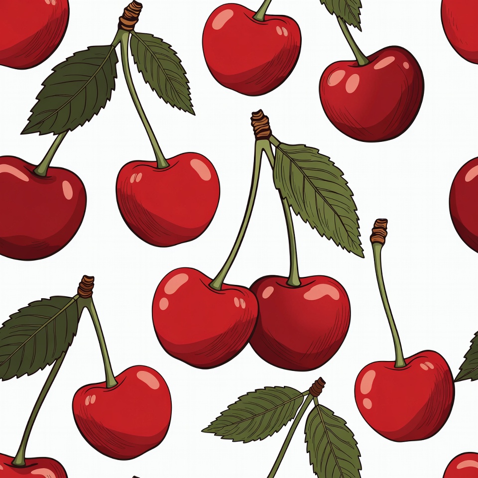 cherry branches, cherry design, cherry illustration, cherry pattern, cherry stems, clipart, fresh cherries, fruit pattern, green leaves, red cherries, repeating cherries, seamless pattern, vector cherries, white background, cherries