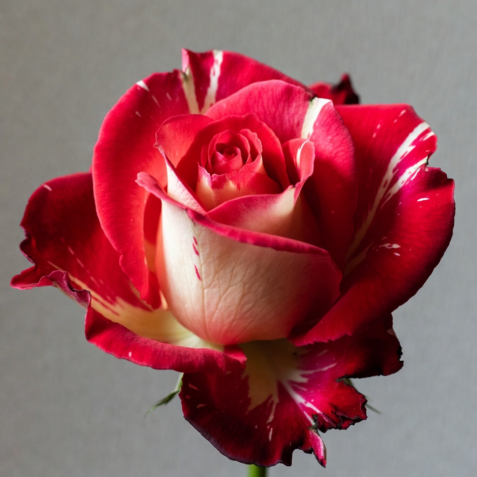 A close-up of a vibrant rose flower with red outer petals and white inner petals edged in red. The petals are layered and slightly curled, revealing intricate details. It stands on a green stem with thorns against a plain gray background.