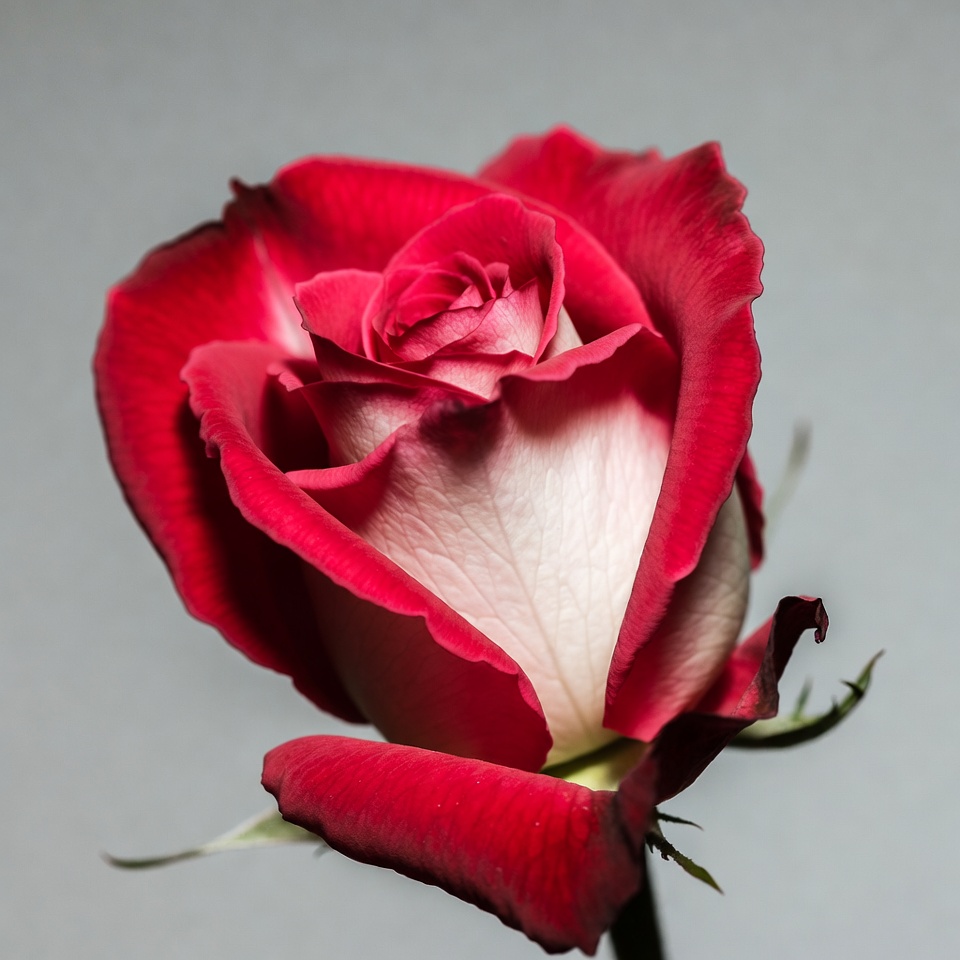 bloom, closeup, floral, flower, garden flower, green stem, hybrid rose, isolated, petals, red flower, rose flower, rose petals, thorn, white background, red rose