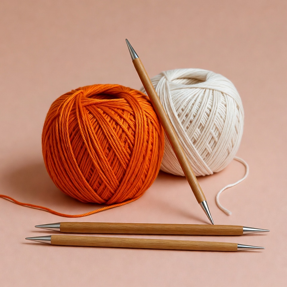 Two balls of yarn, one orange and one white, sit on a pink background. Wooden knitting needles with metal tips are placed across them. The yarn is neatly wound and ready for knitting.