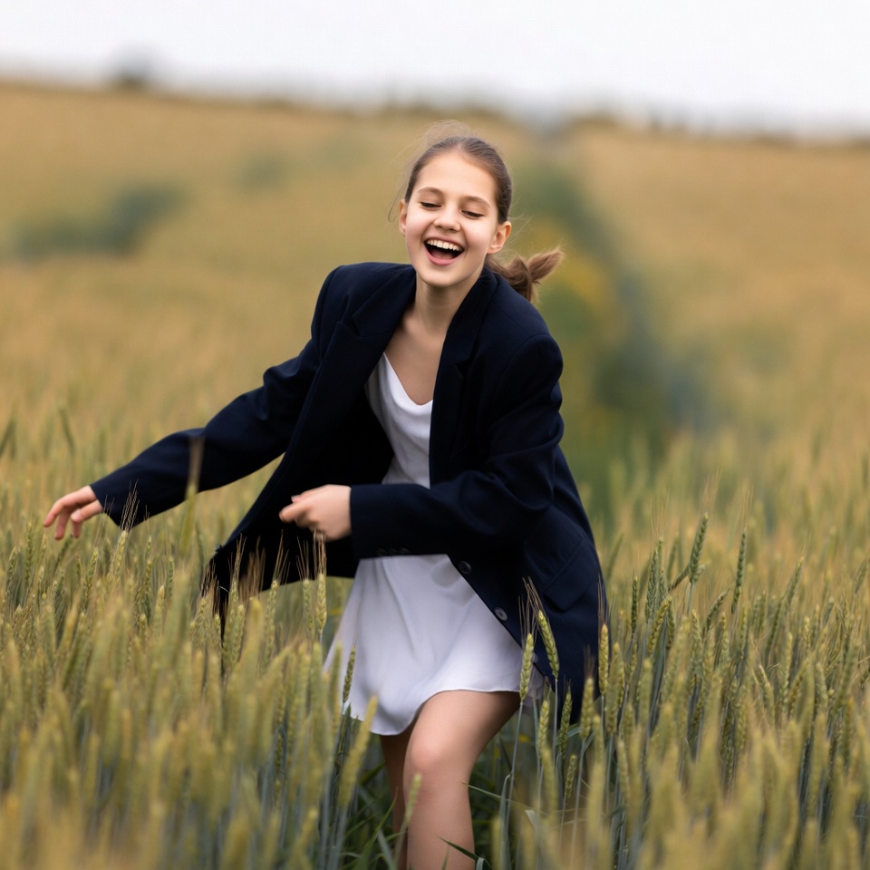 A young girl with blonde hair in ponytails laughs joyfully while standing in a golden wheat field. She wears a white dress under an open navy blue blazer with arms outstretched. The background features rolling green hills under a cloudy sky.