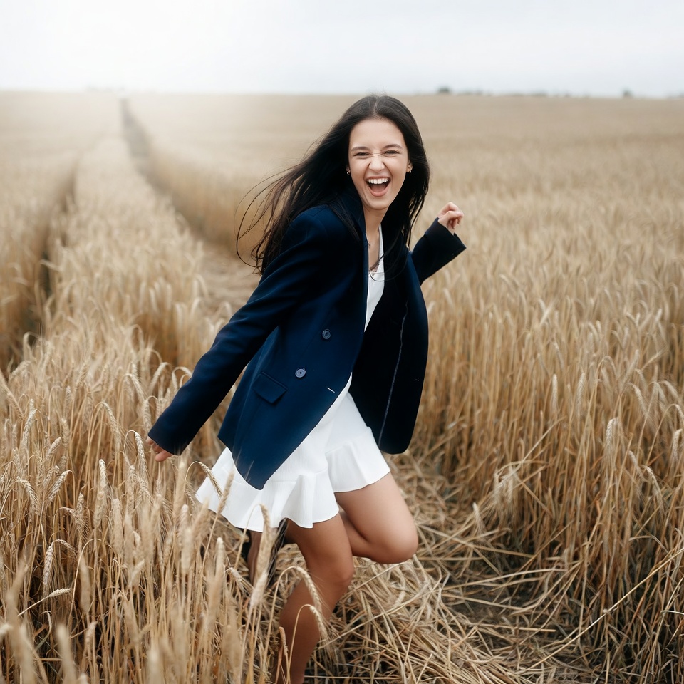 A young woman with long dark hair laughs joyfully while running through a golden wheat field. She wears a navy blue blazer over a short white dress and extends one arm outward. The field stretches behind her under a cloudy sky.
