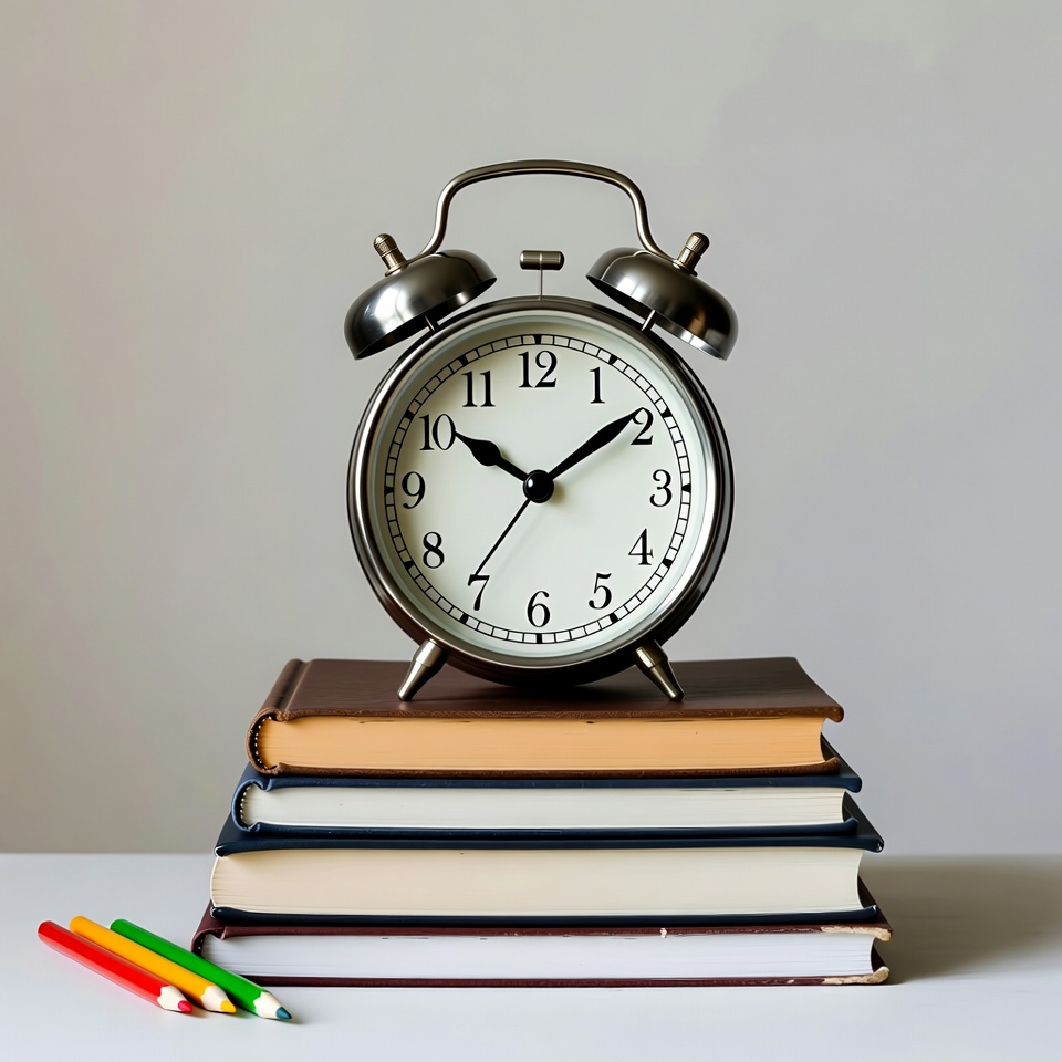 A silver alarm clock with bells on top sits atop a stack of hardcover books in various colors. Colorful pencils lie beside the books on a plain gray background. The clock face displays numbers from 1 to 12 with black hands pointing to 12:00.