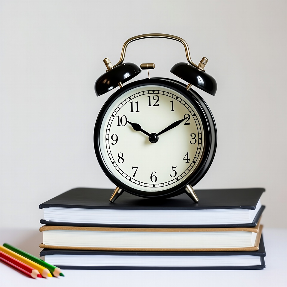 A classic black alarm clock with brass bells sits atop a stack of books on a white background. The clock face shows numbers from 1 to 12 with black hands pointing to around 10:10. Colorful pencils are placed beside the books.