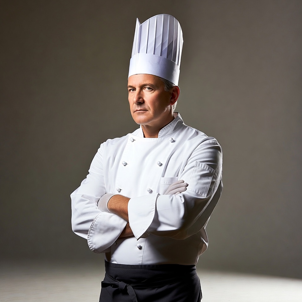 A middle-aged White man wearing a tall white chef's hat and double-breasted white chef's jacket stands with arms crossed. He has a serious expression and black apron tied around his waist. The image features a plain gray background.