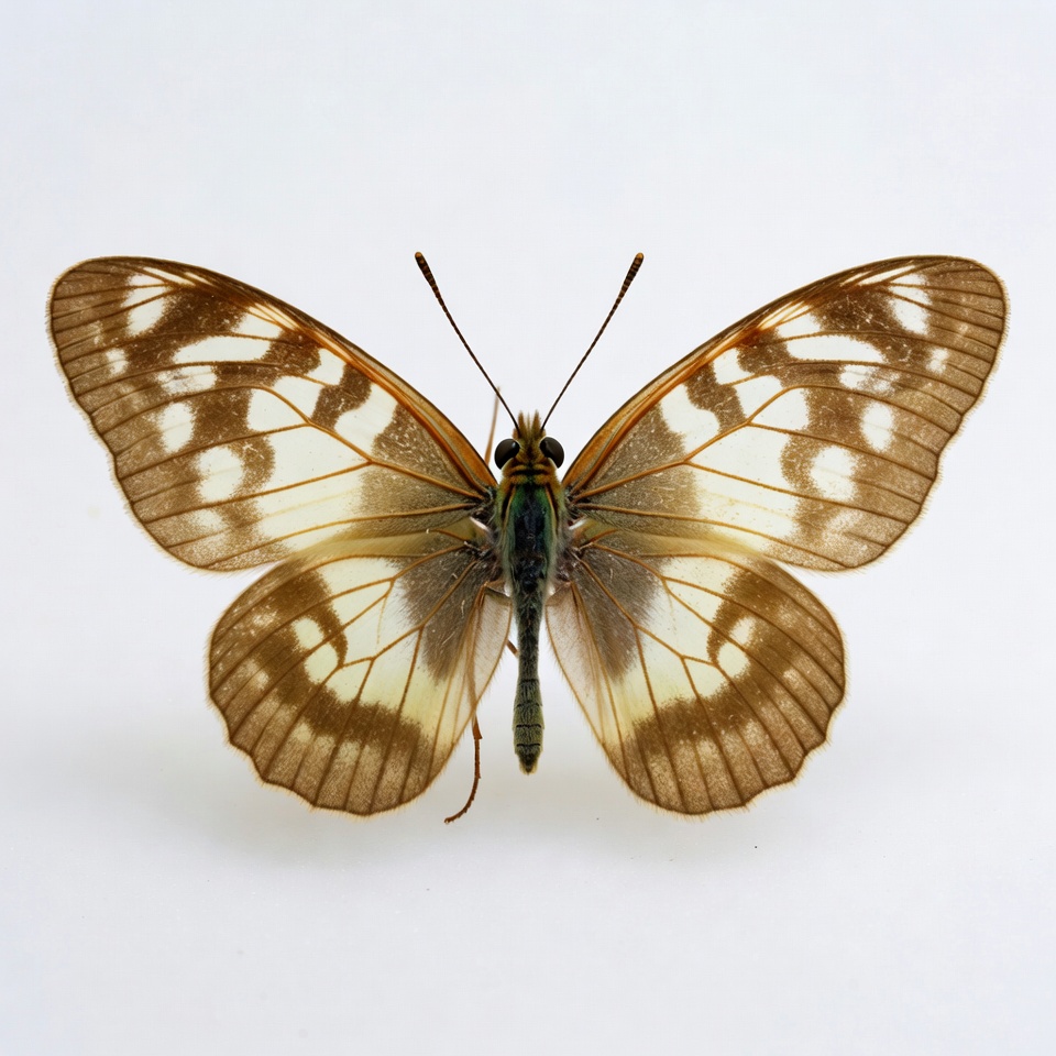 A large butterfly with wings displaying intricate white and brown marbled patterns is posed with wings spread open. The wings feature prominent translucent white areas accented by brown veins and spots. It rests on a plain white background.