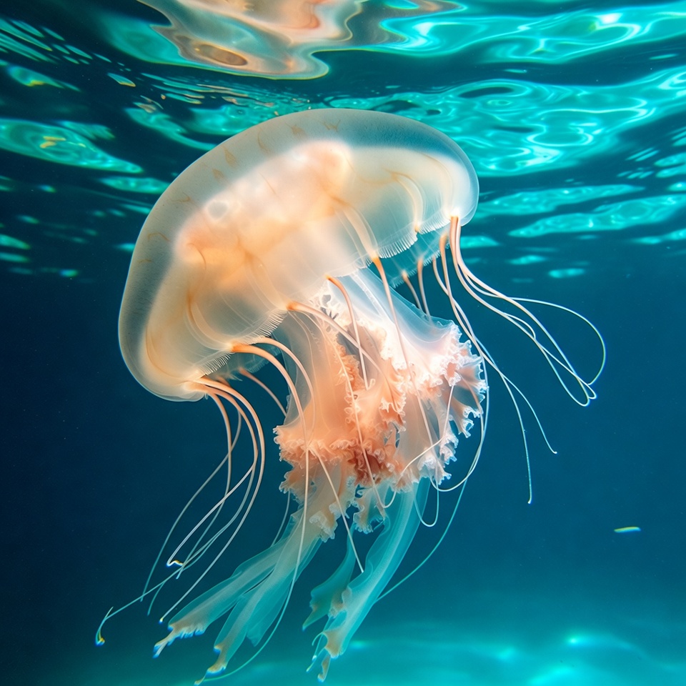 A translucent orange jellyfish with long trailing tentacles floats gracefully in deep blue ocean water. Its bell is dome-shaped and semi-transparent, glowing softly against the aquatic background. Bubbles and light reflections enhance the underwater scene.
