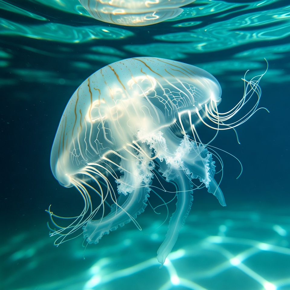 A translucent jellyfish with golden stripes floats gracefully in clear blue ocean water. Long white tentacles trail below its dome-shaped bell, which glows softly. Rippling water surface reflections frame the marine creature from below.