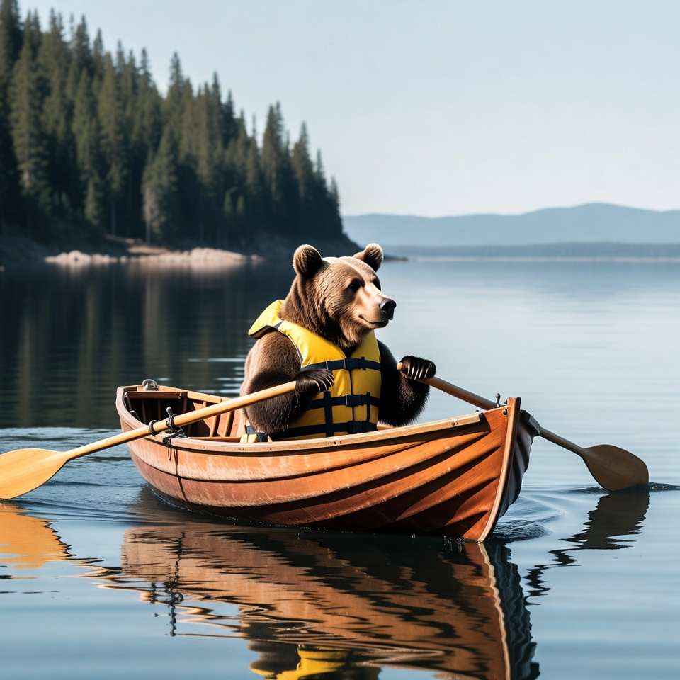 A brown bear wearing a yellow life vest rows a wooden canoe on a calm lake. Tall pine trees line the forested shoreline with mountains in the background under a clear sky. The bear grips orange paddles while reflections shimmer in the water.